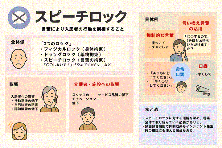 介護現場にはスピーチロックを含め、入居者の行動を制限してしまう「3つのロック」があります。