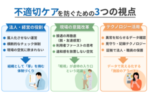 不適切ケアが増えれば事故だけでなく、経営的な数値にも影響が出てきます。施設や事業所任せではなく、横断的なチェック機能を設ける事が重要です。